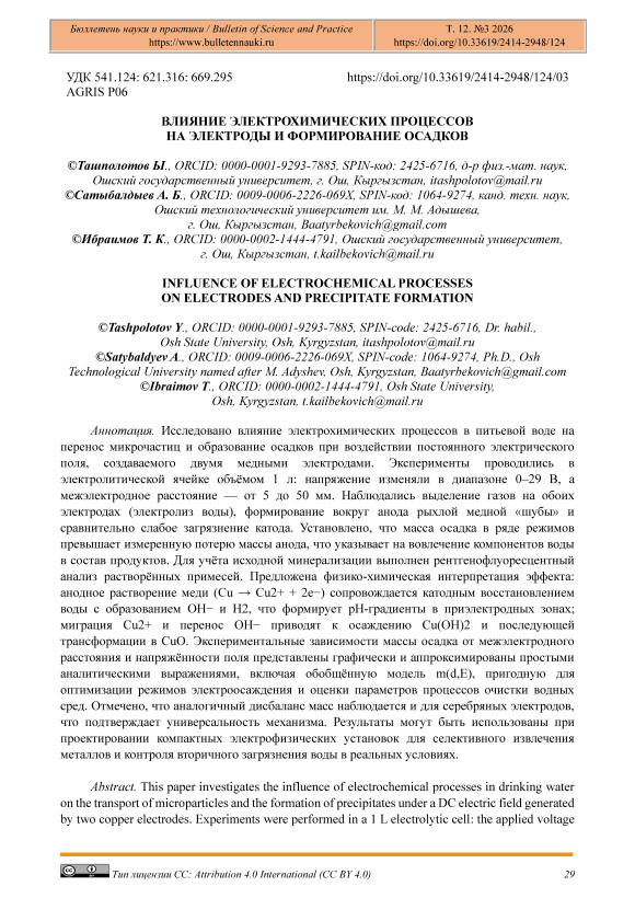 Исследовано влияние электрохимических процессов в питьевой воде на перенос микрочастиц и образование осадков при воздействии постоянного электрического поля, создаваемого двумя медными электродами. Эксперименты проводились в электролитической ячейке объёмом 1 л: напряжение изменяли в диапазоне 0–29 В, а межэлектродное расстояние — от 5 до 50 мм. Наблюдались выделение газов на обоих электродах (электролиз воды), формирование вокруг анода рыхлой медной «шубы» и сравнительно слабое загрязнение катода. Установлено, что масса осадка в ряде режимов превышает измеренную потерю массы анода, что указывает на вовлечение компонентов воды в состав продуктов. Для учёта исходной минерализации выполнен рентгенофлуоресцентный анализ растворённых примесей. Предложена физико-химическая интерпретация эффекта: анодное растворение меди (Cu → Cu2+ + 2e−) сопровождается катодным восстановлением воды с образованием OH− и H2, что формирует pH-градиенты в приэлектродных зонах; миграция Cu2+ и перенос OH− приводят к осаждению Cu(OH)2 и последующей трансформации в CuO. Экспериментальные зависимости массы осадка от межэлектродного расстояния и напряжённости поля представлены графически и аппроксимированы простыми аналитическими выражениями, включая обобщённую модель m(d,E), пригодную для оптимизации режимов электроосаждения и оценки параметров процессов очистки водных сред. Отмечено, что аналогичный дисбаланс масс наблюдается и для серебряных электродов, что подтверждает универсальность механизма. Результаты могут быть использованы при проектировании компактных электрофизических установок для селективного извлечения металлов и контроля вторичного загрязнения воды в реальных условиях.