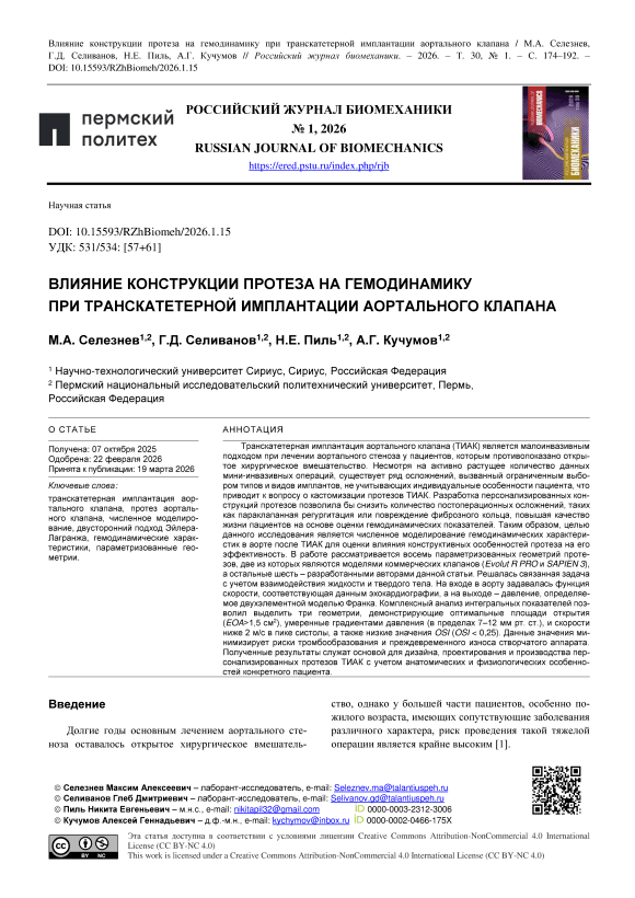 Транскатетерная имплантация аортального клапана (ТИАК) является малоинвазивным подходом при лечении аортального стеноза у пациентов, которым противопоказано открытое хирургическое вмешательство. Несмотря на активно растущее количество данных миниинвазивных операций, существует ряд осложнений, вызванный ограниченным выбором типов и видов имплантов, не учитывающих индивидуальные особенности пациента, что приводит к вопросу о кастомизации протезов ТИАК. Разработка персонализированных конструкций протезов позволила бы снизить количество постоперационных осложнений, таких как параклапанная регургитация или повреждение фиброзного кольца, повышая качество жизни пациентов на основе оценки гемодинамических показателей. Таким образом, целью данного исследования является численное моделирование гемодинамических характеристик в аорте после ТИАК для оценки влияния конструктивных особенностей протеза на его эффективность. В работе рассматривается восемь параметризованных геометрий протезов, две из которых являются моделями коммерческих клапанов (Evolut R PRO и SAPIEN 3), а остальные шесть – разработанными авторами данной статьи. Решалась связанная задача с учетом взаимодействия жидкости и твердого тела. На входе в аорту задавалась функция скорости, соответствующая данным эхокардиографии, а на выходе – давление, определяемое двухэлементной моделью Франка. Комплексный анализ интегральных показателей позволил выделить три геометрии, демонстрирующие оптимальные площади открытия (EOA>1,5 см2), умеренные градиентами давления (в пределах 7–12 мм рт. ст.), и скорости ниже 2 м/с в пике систолы, а также низкие значения OSI (OSI < 0,25). Данные значения минимизирует риски тромбообразования и преждевременного износа створчатого аппарата. Полученные результаты служат основой для дизайна, проектирования и производства персонализированных протезов ТИАК с учетом анатомических и физиологических особенностей конкретного пациента.