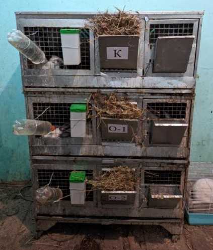 Объект исследования – чистопородные кролики калифорнийской породы. Перед началом проведения эксперимента была проведена индивидуальная оценка кроликов по комплексу хозяйственно полезных признаков в соответствии с требованиями ОСТ 10114-88. Формирование опытных групп осуществлялось по общепринятой методике по принципу пар-аналогов с учетом породы, живой массы, возраста, уровня развития особей, пола (самцы) и состояния здоровья животных, в результате было сформировано три однородных группы кроликов мясного направления продуктивности в возрасте 45 дней по 10 голов в каждой. В течение всего научнохозяйственного эксперимента опытные животные находились в одинаковых зооветеринарных условиях, в клеточных батареях российского производства «Профессионал 95-КО-3», и со- держались согласно принципам гуманности. На рисунке 1 продемонстрировано клеточное содержание кроликов.