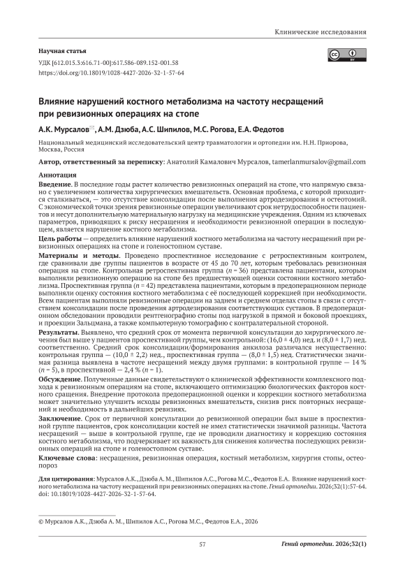 Введение. В последние годы растет количество ревизионных операций на стопе, что напрямую связано с увеличением количества хирургических вмешательств. Основная проблема, с которой приходится сталкиваться, — это отсутствие консолидации после выполнения артродезирования и остеотомий. С экономической точки зрения ревизионные операции увеличивают срок нетрудоспособности пациентов и несут дополнительную материальную нагрузку на медицинские учреждения. Одним из ключевых параметров, приводящих к риску несращения и необходимости ревизионной операции в последующем, является нарушение костного метаболизма. Цель работы — определить влияние нарушений костного метаболизма на частоту несращений при ревизионных операциях на стопе и голеностопном суставе. Материалы и методы. Проведено проспективное исследование с ретроспективным контролем, где сравнивали две группы пациентов в возрасте от 45 до 70 лет, которым требовалась ревизионная операция на стопе. Контрольная ретроспективная группа (n = 36) представлена пациентами, которым выполняли ревизионную операцию на стопе без предшествующей оценки состоянии костного метаболизма. Проспективная группа (n = 42) представлена пациентами, которым в предоперационном периоде выполняли оценку состояния костного метаболизма с её последующей коррекцией при необходимости. Всем пациентам выполняли ревизионные операции на заднем и среднем отделах стопы в связи с отсутствием консолидации после проведения артродезирования соответствующих суставов. В предоперационном обследовании проводили рентгенографию стопы под нагрузкой в прямой и боковой проекциях, и проекции Зальцмана, а также компьютерную томографию с контралатеральной стороной. Результаты. Выявлено, что средний срок от момента первичной консультации до хирургического лечения был выше у пациентов проспективной группы, чем контрольной: (16,0 ± 4,0) нед. и (8,0 ± 1,7) нед. соответственно. Средний срок консолидации/формирования анкилоза различался несущественно: контрольная группа — (10,0 ± 2,2) нед., проспективная группа — (8,0 ± 1,5) нед. Статистически значимая разница выявлена в частоте несращений между двумя группами: в контрольной группе — 14 % (n = 5), в проспективной — 2,4 % (n = 1). Обсуждение. Полученные данные свидетельствуют о клинической эффективности комплексного подхода к ревизионным операциям на стопе, включающего оптимизацию биологических факторов костного сращения. Внедрение протокола предоперационной оценки и коррекции костного метаболизма может значительно улучшить исходы ревизионных вмешательств, снизив риск повторных несращений и необходимость в дальнейших ревизиях. Заключение. Срок от первичной консультации до ревизионной операции был выше в проспективной группе пациентов, срок консолидации костей не имел статистически значимой разницы. Частота несращений — выше в контрольной группе, где не проводили диагностику и коррекцию состояния костного метаболизма, что подчеркивает их важность для снижения количества последующих ревизионных операций на стопе и голеностопном суставе.