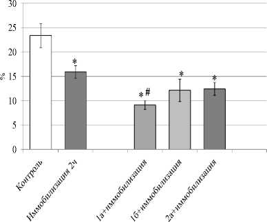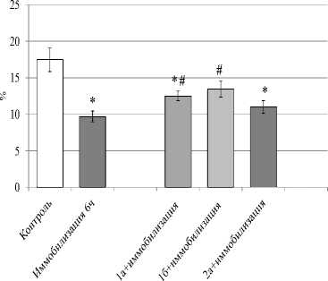 * - р <0.05 по сравнению с контролем, # - р <0.05 по сравнению иммобилизацией, количество животных в группах: n=7 (для 2-часовой иммобилизации) и n=8 (для 6-часовой иммобилизации)