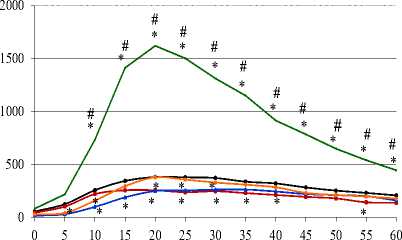 * - p <0.05 к контролю, # - p <0.05 к стрессу, количество животных: в контрольной при двухчасовой иммобилизации n=8, в остальных группах n=9. По оси y – относительные единицы люминисценции, по оси x – время