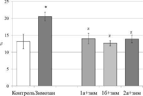 По оси ординат – процент лейкоцитарного фагоцитоза, * - p <0.05 к контролю, z - p <0.05 к группе «зимозан», a - p <0.05 к группе «1б+зимозан», количество животных в каждой группе n=10