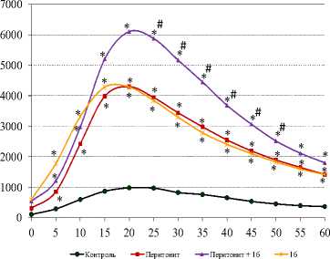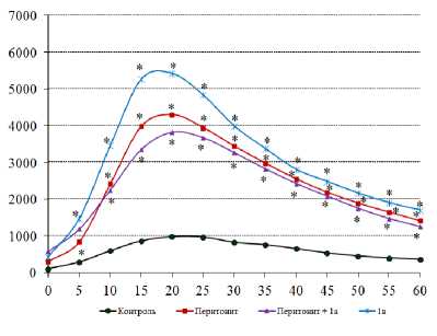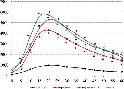 * - p < 0,05 к контролю, # - р < 0,05 к стрессу; количество животных в группах: контрольной - 8, с зимозановым перитонитом – 10, в опытных для 1а, 1б – 10, в опытных для 2а – 7. По оси y – относительные единицы люминисценции, по оси x – время