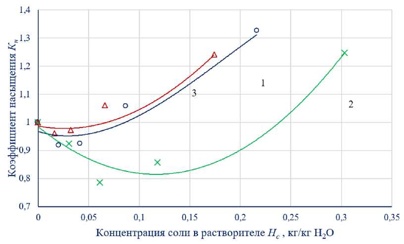 Рисунок 1 – Влияние некоторых солей на коэффициент насыщения Кн : 1 – NaHCО3; 2 – CaCl2; 3 – NaCl.