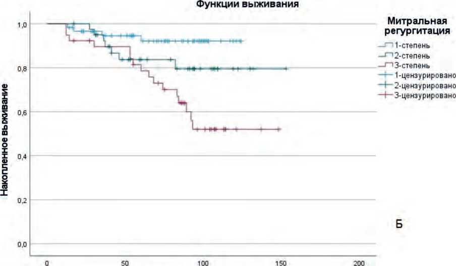 Рис. 2. Кривые Каплана – Мейера кумулятивной выживаемости пациентов в зависимости от: а – наличия / отсутствия хронической фибрилляции предсердий, уровень значимости различий р = 0,308 (лог-ранговый тест); б – дооперационной степени митральной регургитации, уровень значимости различий р = 0,020 (лог-ранговый тест)