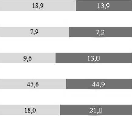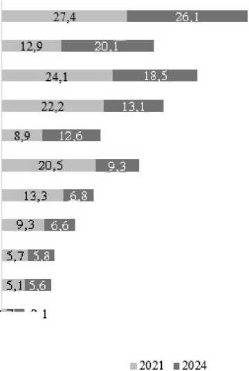 Сравнительный анализ профессиональных планов работников в 2021–2024 гг. выявил значимые изменения: доля респондентов, планирующих смену профессии, сократилась с 18,9% до 13,9%, тогда как намерение повысить квалификацию возросло с 9,6% до 13,0% (Рисунок 3). При этом доля удовлетворённых текущей профессией осталась стабильной (~45%). Увеличение затруднившихся с ответом (с 18,0% до 21,0%) может отражать растущую неопределённость на рынке труда. Параллельно зафиксировано снижение интереса к смене места работы без изменения профессии (с 7,9% до 7,2%), что противоречит ожиданиям роста трудовой мобильности.
