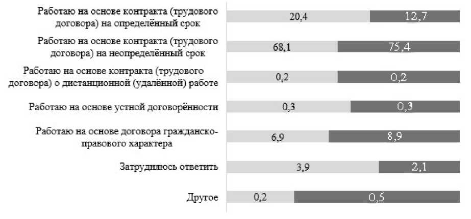 Сравнительный анализ трудовых отношений в 2021–2024 гг. показал усиление формализации занятости: доля бессрочных договоров выросла с 68,1% до 75,4%, тогда как срочных снизилась с 20,4% до 12,7%; гражданско-правовые контракты немного увеличились (с 6,9% до 8,9%), дистанционная занятость осталась минимальной (0,2%) (Рисунок 2). Это указывает на укрепление стабильности и правовой защищённости работников бюджетного сектора.