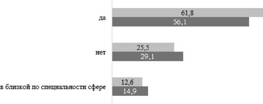 Так, доля, работающих по полученной специальности, сократилась с 61,8% до 56,1%, в то время как процент тех, кто не работает по специальности, увеличился с 25,5% до 29,1%. Одновременно отмечается рост занятости в близких к специальности сферах – с 12,6% до 14,9%. Данная динамика обусловлена комплексом факторов, специфичных для бюджетного сектора. Образуется институциональный разрыв между компетенциями, формируемыми системой профессионального образования и актуальными требованиями бюджетных организаций, что особенно проявляется в сферах образования, здравоохранения и социального обслуживания.