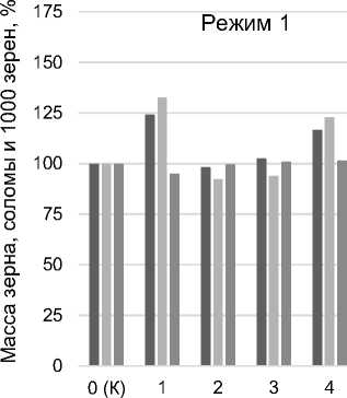 Облучение семян яровой пшеницы перед посевом дозой 5 кГр статистически значимо увеличивало массу зерна на 54,8% и соломы на 57,2% в расчёте на одно растение в режиме 1 и в режиме 2 – на 51,3% и 59,8% соответственно (рис. 1).