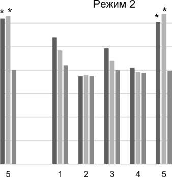 При использовании режима 1 в вариантах с дозами 4 и 5 кГр выявлена прямая связь между выходом зерна с 1 растения и числом зёрен в колосе – коэффициент корреляции r=0,968 и 0,969; между выходом зерна с 1 растения и массой зерна с колоса – r=0,987 и 1,00; между выходом зерна с 1 растения и количеством продуктивных стеблей – r=0,969 и 0,965.