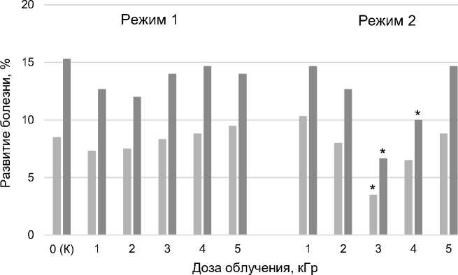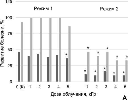 В фазе кущения степень поражения растений Bipolaris sorokiniana при дозе 5 кГр в режиме 1 снизилась, по сравнению с контролем, в 1,5 раза, при дозах 1-5 кГр в режиме 2 – в 2,4-4,0 раза (рис. 2А). Распространённость гельминтоспориоза при облучении в режиме 2 снижалась независимо от дозы в 2,0-2,8 раза. В вариантах с режимом 1 различия были не значимыми.