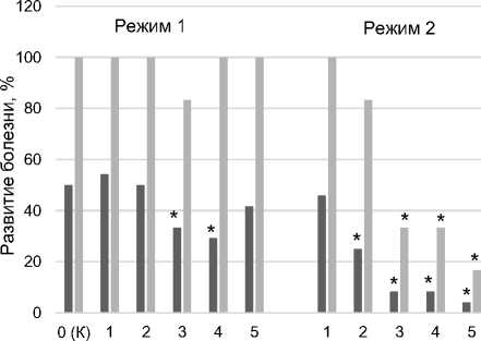 4) Распространённость болезни достоверно уменьшалась при использовании режима 2: в фазе кущения – в 2,0-2,8 раза (дозы 1-5 кГр), в фазе колошения – в 3,0-6,0 раз (дозы 3-5 кГр).