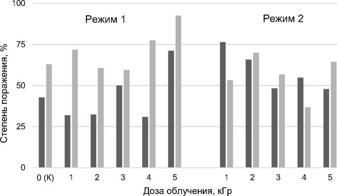 Рис. 3. Зависимость поражения растений пшеницы стеблевой ржавчиной Puccinia graminis tritici в фазе колошения от режима и дозы облучения .