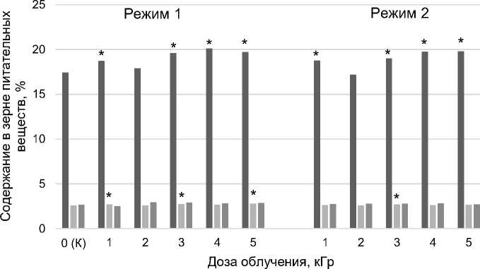 Рис. 4. Влияние режима и дозы облучения на качество урожая яровой пшеницы Ирень.