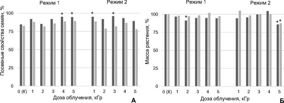 Негативное влияние (рис. 5Б) предпосевного облучения проявилось в достоверном снижении сырой массы на 15% и сухой массы 7-суточных проростков на 13% в расчёте на одно растение в варианте с дозой 5 кГр (режим 2).