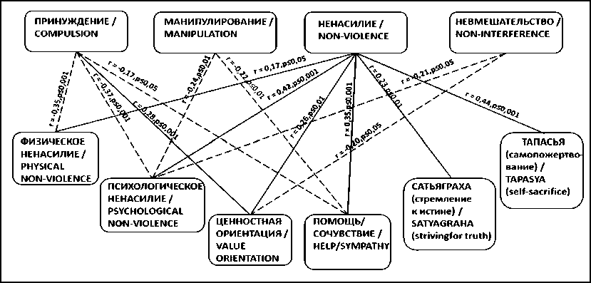 Как видно из рисунка, выбор позиции принуждения положительно коррелирует только с одним параметром отношения к ненасилию – ценностной ориентацией (r = 0,28, p ≤ 0,001) и отрицательно – с физическим ненасилием (r = -0,35, p ≤ 0,001), психологическим ненасилием (r = -0,37, p ≤ 0,001) и помощью/сочувствием (r = -0,17, p ≤ 0,05). Позиция манипулирования обнаружила две отрицательные связи – с психологическим ненасилием (r = -0,24, p ≤ 0,01) и помощью/ сочувствием (r = -0,22, p ≤ 0,01). В отличие от принуждения и манипулирования, позиция ненасилия положительно коррелирует со всеми параметрами отношения к ненасилию: физическим ненасилием (r = 0,17, p ≤ 0,05), психологическим ненасилием r = 0,42, p ≤ 0,001), ценностной ориентацией (r = 0,26, p ≤ 0,001), помощью/сочувствием (r = 0,35, p ≤ 0,001), «сатьяграхой» (r = 0,23, p ≤ 0,001) и «тапасьей» (r = 0,44, p ≤ 0,001). Таким образом, наиболее сильные связи обнаружены с психологическим ненасилием, помощью/сочувствием и «тапасьей» (способностью к самопожертвованию, к уступкам). Наконец, позиция невмешательства обнаружила только две отрицательные связи: