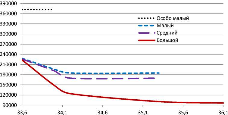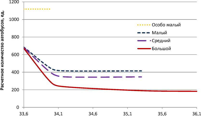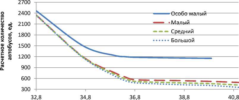 Как видно из рисунка 2, в городе Нижний Тагил, при интервале движения автобусов на маршруте в размере 2 минут, потребуется 2341 единица подвижного состава малого, среднего или большого класса. Автобусов особо малого класса в этом случае потребуется 2465 единиц, что на 5% больше, чем подвижного состава других классов. Примечательно, что снижение интервала движения автобусов особо малого класса в размере более 10 минут, приводит к тому, что пассажиропоток практически на всех маршрутах начинает превышать провозную способность подвижного состава. Поэтому на рисунке 2, кривая для автобусов малого класса прерывается на значении 39,9 минуты.