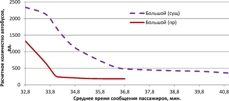 Как видно из рисунка 4, переход на пересадочную модель перевозки, позволит снизить количество используемого подвижного состава большого класса практически в 2 раза (с 1322 до 2341 единиц). Особенно это касается условий, когда необходимо минимизировать времени поездки пассажира (32,8 минуты в среднем). Вместе с этим, если принять равное количество подвижного состава для обоих моделей перевозки (например, 1322 автобуса), использование пересадочной схемы перевозки позволяет снизить на 1,5 – 2 минуты времени сообщения пассажира.