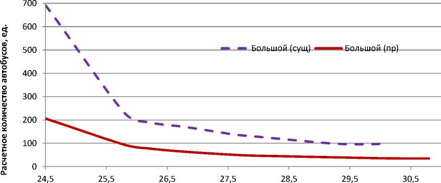 Исследование проведенные автором показали, что снижение интервалов движения между автобусами для существующих схем проектирования маршрутных систем, а именно направленных на минимизацию пересадок, одновременно со снижением среднего времени сообщения пассажиров, ведут к росту необходимого количества подвижного состава, используемого на линии (смотрим рисунок 2). При этом видно, что по мере снижения интервала движения, разница в количестве подвижного состава различного класса постепенно снижается.