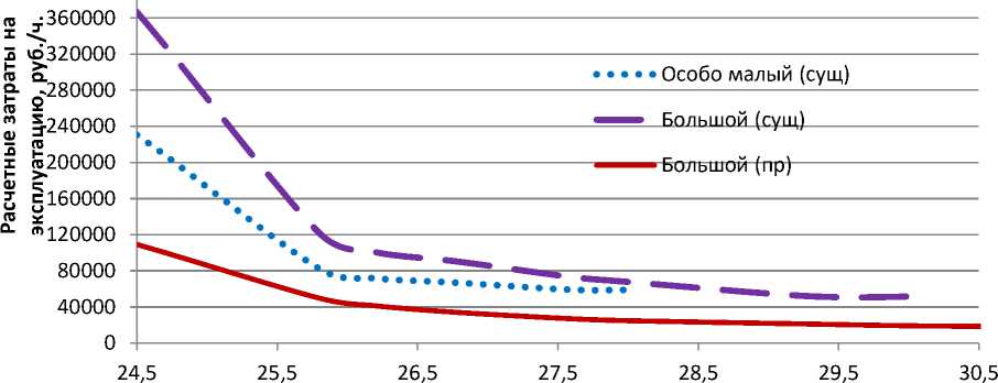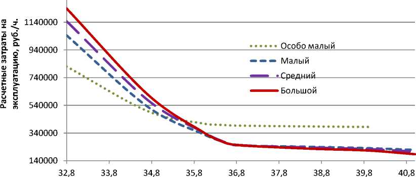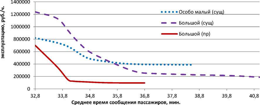 Исследование эксплуатационных затрат показали, что в существующих условиях, беспересадочной модели перевозки, оптимально использовать подвижной состав особо малого класса, особенно если необходимо минимизиро- вать среднее время сообщения пассажира (смотрим рисунок 6). При этом видно, что в аналогичных условиях, использование больших автобусов обходится в 1,5 раза дороже.