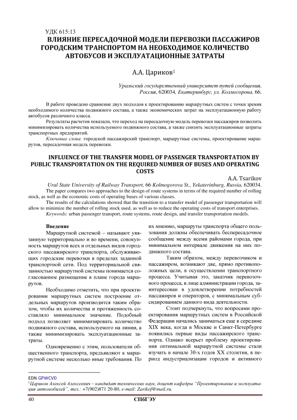 Текст научной статьи Влияние пересадочной модели перевозки пассажиров городским транспортом на необходимое количество автобусов и эксплуатационные затраты