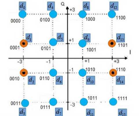 по QAM-символам di первого квадранта сигнального созвездия QAM-16, изображенного на рисунке 2, память канала при этом учитывалась равной трем, то есть задавались тремя отсчетами импульсной характеристики.