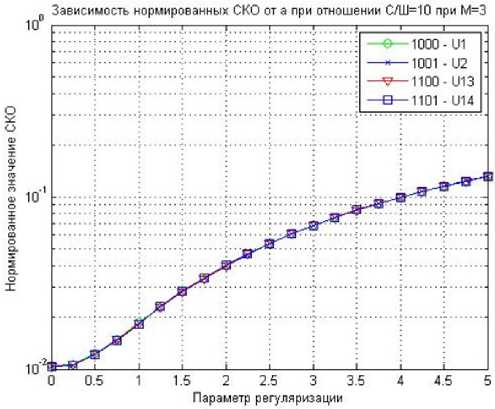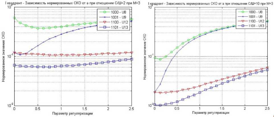 Анализ построенных графиков зависимости нормированных СКО от коэффициента регуляризации показывает, что при различных вариантах испытательных комбинаций наблюдается значительное количество ошибок оценки методом регуляризации (различие величин нормированных СКО), что проявляется как при высоком уровне отношения сигнал/шум 10 дБ, так и при низком – 2 дБ. Из рисунка 3 следует, что минимальным значением СКО (нижняя кривая рисунка 3) обладает испытательная комбинация U13 , полученная 16-ю «четверками» кодовых символов 1101, которым соответствуют значения 16-ти QAM-символов d 13 = 3 +1 j .