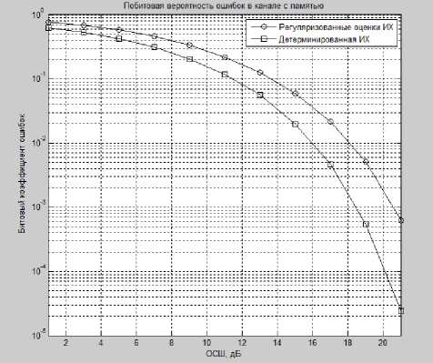 – при отношении сигнал-шум 5 дБ вероятность появления битовой ошибки достигает 0,58 для системы с регуляризованными оценками импульсной характеристики, в то время как для детерминированной (точно известной) импульсной характеристики – 0,42;