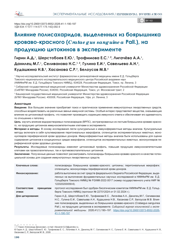 Влияние полисахаридов, выделенных из боярышника кроваво-красного (Crataegus sanguinea Pall.), на продукцию цитокинов в эксперименте