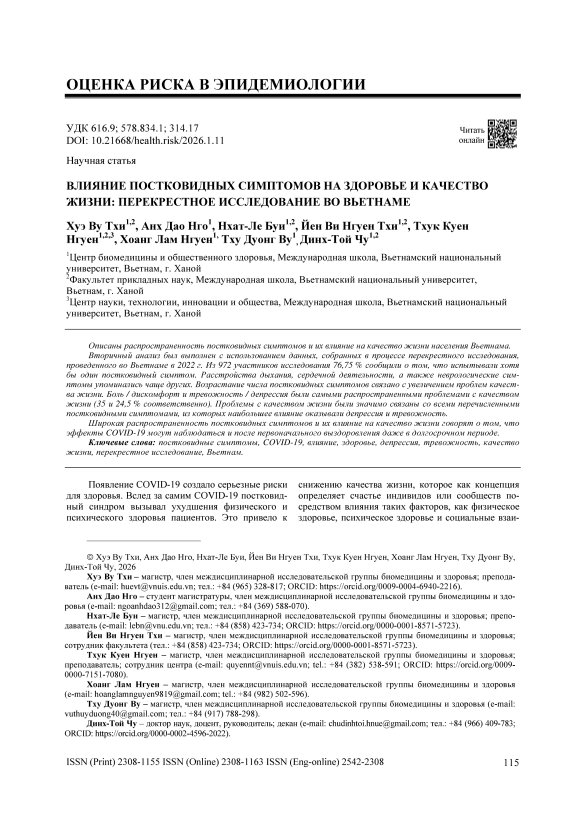 Описаны распространенность постковидных симптомов и их влияние на качество жизни населения Вьетнама. Вторичный анализ был выполнен с использованием данных, собранных в процессе перекрестного исследования, проведенного во Вьетнаме в 2022 г. Из 972 участников исследования 76,75 % сообщили о том, что испытывали хотя бы один постковидный симптом. Расстройства дыхания, сердечной деятельности, а также неврологические симп-томы упоминались чаще других. Возрастание числа постковидных симптомов связано с увеличением проблем качества жизни. Боль / дискомфорт и тревожность / депрессия были самыми распространенными проблемами с качеством жизни (35 и 24,5 % соответственно). Проблемы с качеством жизни были значимо связаны со всеми перечисленными постковидными симптомами, из которых наибольшее влияние оказывали депрессия и тревожность. Широкая распространенность постковидных симптомов и их влияние на качество жизни говорят о том, что эффекты COVID-19 могут наблюдаться и после первоначального выздоровления даже в долгосрочном периоде.