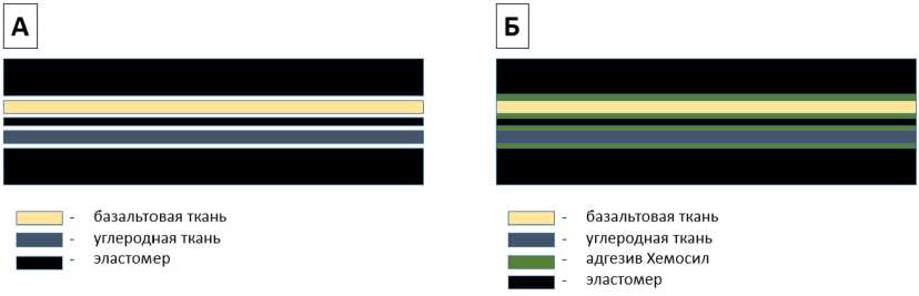 Для повышения адгезионной прочности базальто- и углеткани предварительно обрабатывались Хемосилом, а затем укладывались между слоями эластомера по схеме (рис. 1б) (БТ/СКД/УТ (Хем)). Также для сравнения исследовался образец без поверхностной обработки БТ и УТ (рис. 1а) (БТ/СКД/УТ).