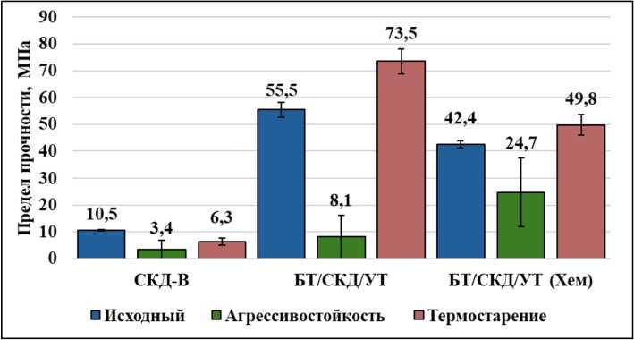 Рис. 2. Диаграмма предела прочности эластомера и композитов до, после выдержки в гидравлическом масле АМГ-10 и термического старения