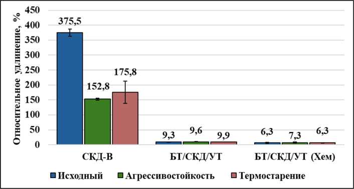 Также получены результаты относительного удлинения образцов СКД, БТ/СКД/УТ и БТ/ СКД/УТ (Хем) после воздействия гидравлического масла АМГ-10 и термического старения, представленные на рис. 3. Армирование резины высокомодульными волокнами ведет за собой