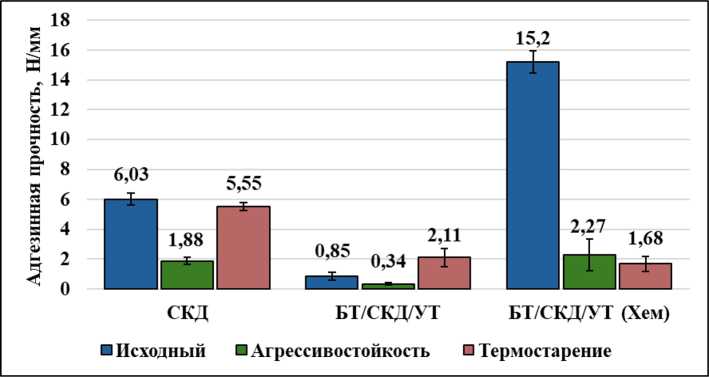 Fig. 4. Diagram showing elastomer delamination indicators from high-modulus fibers before and after exposure to AMG-10 hydraulic oil and thermal aging граница раздела между углеродными волокнами (УВ) и эластомером. Образование четких границ и зазоров между материалами указывает на слабое адгезионное взаимодействие, что подтверждается результатами испытания на расслоение. Образец композита с поверхностно обработанными волокнами клеем Хемосил имеет на поверхности обломки БВ (рис. 5в), что свидетельствует о более сильном взаимодействии между волокнами и резиной. Увеличение прочности также подтверждается испытанием на расслоение и наличием плотного контакта