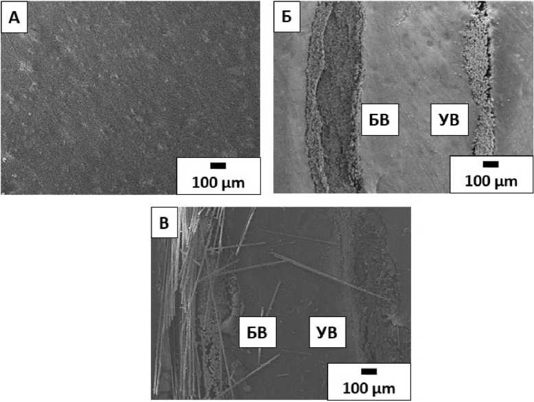 На рис. 5 представлены микрофотографии срезов образцов для определения визуального влияния поверхностной обработки БТ и УТ на контакт с эластомером. Эластомерная матрица (рис. 5а) имеет однородную структуру, структурный однородный вид матрицы характерен для всех исследуемых образцов, что позволяет сосредоточиться на оценке межфазной границы раздела с волокном. У образца без поверхностной обработки (рис. 5б) наблюдается неплотное прилегание базальтовых волокон (БВ) к эластомерной матрице, также видна четкая – 21 –