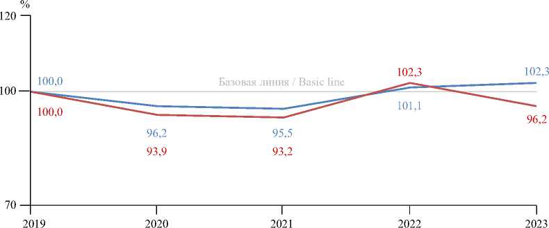F i g. 1. Dynamics of Scope 1 and Scope 2 greenhouse gas emissions and hydrocarbon production of Saudi Aramco in 2019–2023, %