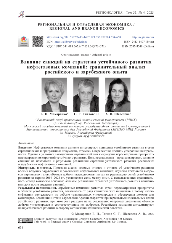 Введение. Нефтегазовые компании активно интегрируют принципы устойчивого развития в свои стратегические и программные документы, стремясь в перспективе достичь углеродной нейтральности. Однако в условиях санкционных ограничений они вынуждены пересматривать приоритетные направления стратегий устойчивого развития. Цель исследования – проанализировать влияние санкций на показатели и результаты реализации стратегий устойчивого развития российских и зарубежных нефтегазовых компаний. Материалы и методы. Проведен анализ годовых отчетов и отчетов об устойчивом развитии восьми ведущих зарубежных и российских нефтегазовых компаний; изучены показатели выбросов парниковых газов, объемов добычи углеводородов, затрат на реализацию целей устойчивого развития за период 2019–2023 гг., установлена связь между ними. С использованием сравнительного метода выявлены основные аспекты реализации стратегий устойчивого развития компаниями до и после введения санкций. Результаты исследования. Зарубежные компании развитых стран пересматривают приоритеты в области устойчивого развития, отказываясь от ряда климатических инициатив в пользу интенсификации деятельности по добыче традиционных углеводородов и обеспечения доходов для акционеров. Компании Китая и Саудовской Аравии стараются придерживаться изначальных целей устойчивого развития, при этом рост расходов на их реализацию опережает увеличение объемов добычи углеводородов и соответствующих им выбросов. Российские компании актуализируют цели устойчивого развития в сторону активизации климатической повестки. Обсуждение и заключение. В условиях санкций в стратегиях устойчивого развития необходимо соблюсти баланс интересов всех причастных: акционеров, руководства компаний, государства и общества. Материалы и выводы исследования будут полезны руководству компаний, которые находятся на стадии интеграции экологических целей в стратегии развития, а также органам государственной власти, разрабатывающим политику низкоуглеродного развития.