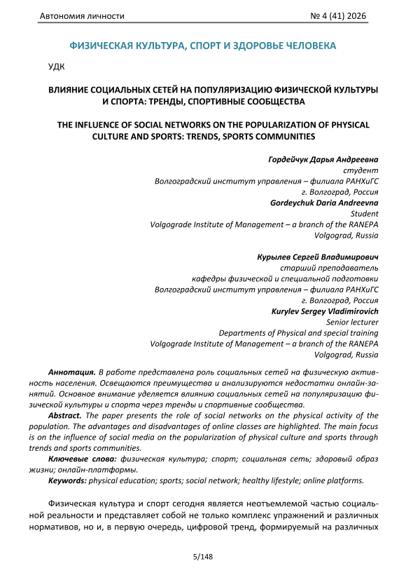 В работе представлена роль социальных сетей на физическую активность населения. Освещаются преимущества и анализируются недостатки онлайн-занятий. Основное внимание уделяется влиянию социальных сетей на популяризацию физической культуры и спорта через тренды и спортивные сообщества.
