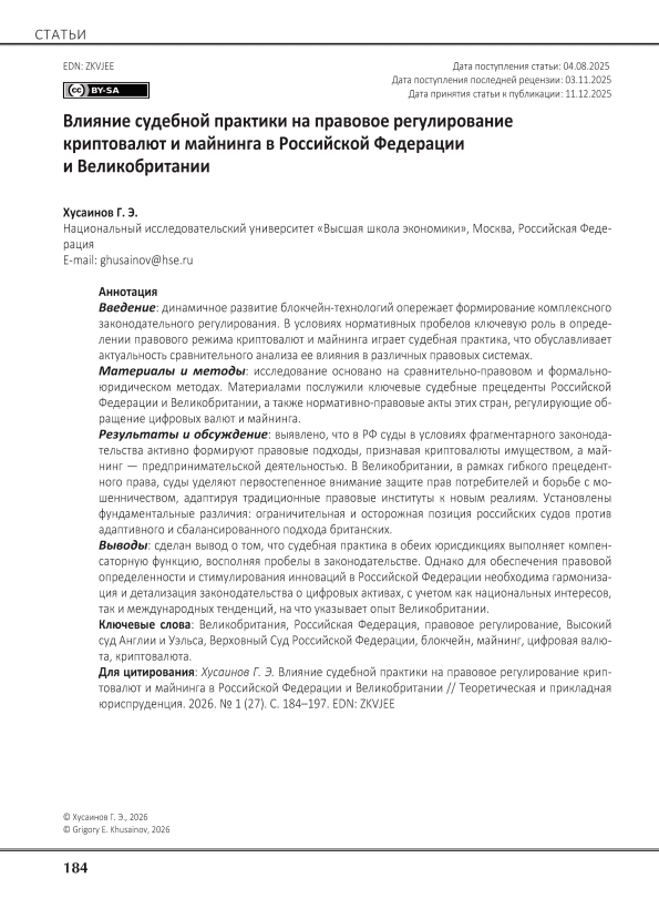 Introduction: The swift evolution of digital asset technologies continues to outpace the development of comprehensive regulatory frameworks. In this context of legislative gaps, court rulings play a pivotal role in shaping the legal status of cryptocurrencies and mining, underscoring the relevance of a comparative analysis of their impact across different legal systems. Methodology and materials: This study employs comparative legal and formal legal methods. Its analytical foundation comprises landmark court precedents from the Russian Federation and the United Kingdom, alongside relevant regulatory acts from both jurisdictions concerning digital assets. Results of the study and their discussion: The analysis reveals that in Russia, amidst a fragmented legislative landscape, courts are actively formulating legal doctrines by classifying cryptocurrencies as property under the Civil Code and recognizing mining as an entrepreneurial activity. Conversely, in the UK, leveraging its flexible common law system, courts focus primarily on consumer protection and anti-fraud measures, adapting traditional legal concepts such as injunctive relief to new digital realities. The study identifies a fundamental divergence: a restrictive and cautious judicial stance in Russia contrasts with a more adaptive and balanced approach in British jurisprudence Conclusions: The study concludes that judicial practice in both jurisdictions serves a compensatory role, addressing legislative voids. However, to foster legal certainty and encourage innovation, Russia requires more harmonized and detailed legislation on digital assets. The UK’s experience offers a valuable reference point in this regard, highlighting the need to align regulatory development with both national priorities and international trends.