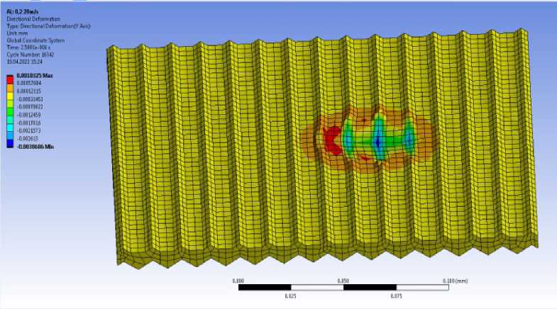Предельные скорости в диапазоне от 30 до 70 м/с создадут контактные напряжения, достаточные для деформации как покрытия, так и основы. Поэтому диапазон скоростей рабочих тел, при которых деформации основы детали остаются незначительными, следует принять от 10 до 20 м/с. Результат деформации покрытия, спрогнозированный для данного диапазона при контакте с рабочим телом диаметром D = 0,2 мм со скоростью V = 20 м/с, приведен на рисунке 1.
