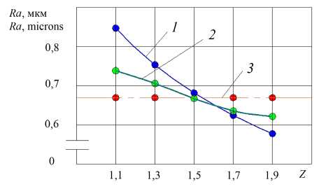 Р и с. 2. Зависимости шероховатости поверхности Ra от передаточного отношения z , полученные на режимах обработки ( n 1 = 100 об/мин; C = 40 %; t = 6 мин):