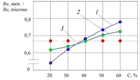 1 – experimental data; 2 – calculated dependence; 3 – limiting roughness level Ra