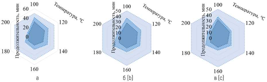 Рисунок 1 – Влияние продолжительности и температуры термообработки образцов поли[АН–со–АМПС] на их растворимость в ДМФ (при содержании кислотного сомономера: а – 20 %, б – 25 %, в – 30 %) Figure 1 – Effect of duration and temperature of heat treatment of poly[AN–co–AMPS] samples on their solubility in DMF (with an acid comonomer content of: a – 20 %, b – 25 %, c – 30 %)