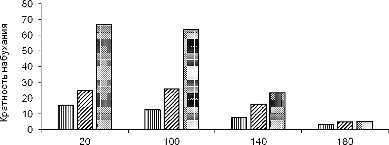 Для ионообменных полимерных материалов набухание является важной характеристикой, так как недостаточное набухание приводит к недоступности значительной доли ионообменных групп, а чрезмерное набухание приводит к увеличению продолжительности процесса насыщения сорбента сорбатом, а также к существенной потере прочности ионита. Поэтому была проанализирована кратность набухания образцов поли[АН–со–АМ-ПС-Н], подвергнутых термообработке, в разных средах. Полученные результаты (рисунки 2–4) свидетельствуют о том, что по мере увеличения температуры термического воздействия на иониты сокращается кратность их набухания. По-видимому, причиной этого является увеличение количества межмолекулярных химических связей, что и являлось целью проведения такого рода модификации ионитов.