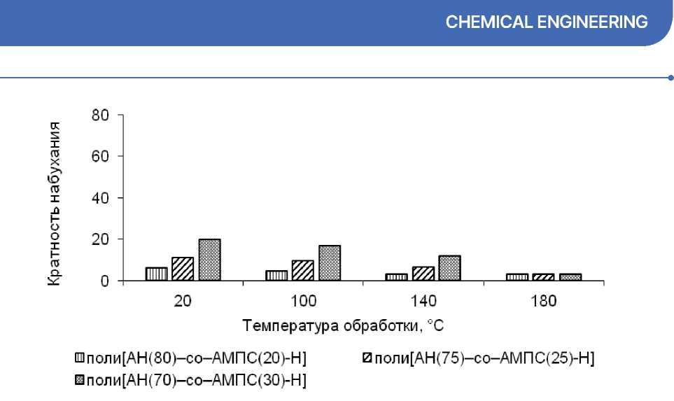 АМПС(20)] на способность растворяться в ДМФ. Минимальная температура выдерживания образцов составила 100 °C, поскольку, как известно из литературных источников (Toms et al., 2020; Sen, 2003; Wang and Xin, 2025), ниже этого значения в сополимерах АН практически не происходит химических превращений, по крайне мере, в течение относительно непродолжительного времени. При температуре более 200 °C, наоборот, начинаются многочисленные химические реакции в полимерном субстрате, что негативно будет отражаться на химической структуре ионитов, вплоть до снижения сорбционной способности. Промежуток времени, через который осуществляли отбор образцов из термошкафа, составлял 2 мин. Это позволило выбрать условия термообработки всех видов образцов сополимеров АН, поскольку было установлено, что в течение примерно 30 минут сополимер теряет способность растворяться в ДМФ, через 40 минут – способность набухать (даже при обработке при самой низкой температуре (100 °C). При проведении эксперимента над образцами, содержащими бóльшее количество АМПС (25 и 30 % (масс.)), продолжительность термообработки увеличили до 50–60 минут с целью обеспечения большей интенсивности их сшивки макромолекул.