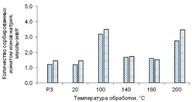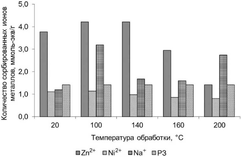Из данных, представленных на рисунке 6, видно, что количество ионов цинка, сорбированных немоди-фицированным образцом поли[АН(75)–со–АМПС(25)], значительно превышает СОЕ (по ионам Na+). Термообработка ионита при 100 и 140 °C приводит к некоторому повышению сорбционной способности по ионам цинка. Дальнейшее повышение температуры модификации до 160–200 °C приводит к уменьшению количества сорбированных ионов цинка. В случае ионов никеля превышения количества сорбированных ионов, по сравнению с расчетным и экспериментальными значениями СОЕ, не наблюдается ни до термообработки, ни после нее. Более того, имеется тенденция к снижению сорбционной активности сорбента на основе поли[АН(75)–со–АМПС(25)] по отношению к никелю. Такой результат позволяет надеяться на увеличение избирательности сорбции ионов цинка ионитами на основе поли[АН(75)–со–АМПС(25)] в сравнении с ионами никеля.