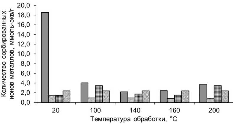 Рисунок 6 – Влияние температуры термообработки поли[АН(75)–со–АМПС(25)] на количество ионов металлов, сорбированных из 0,1 н растворов сорбатов Figure 6 – Effect of heat treatment temperature of poly[AN(75)–co–AMPS(25)] on the amount of metal ions sorbed from 0,1 N sorbate solutions