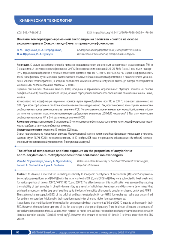 Влияние температурно-временной экспозиции на свойства ионитов на основе акрилонитрила и 2-а криламид-2-метилпропансульфокислоты