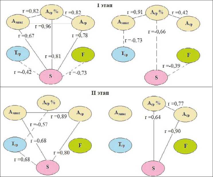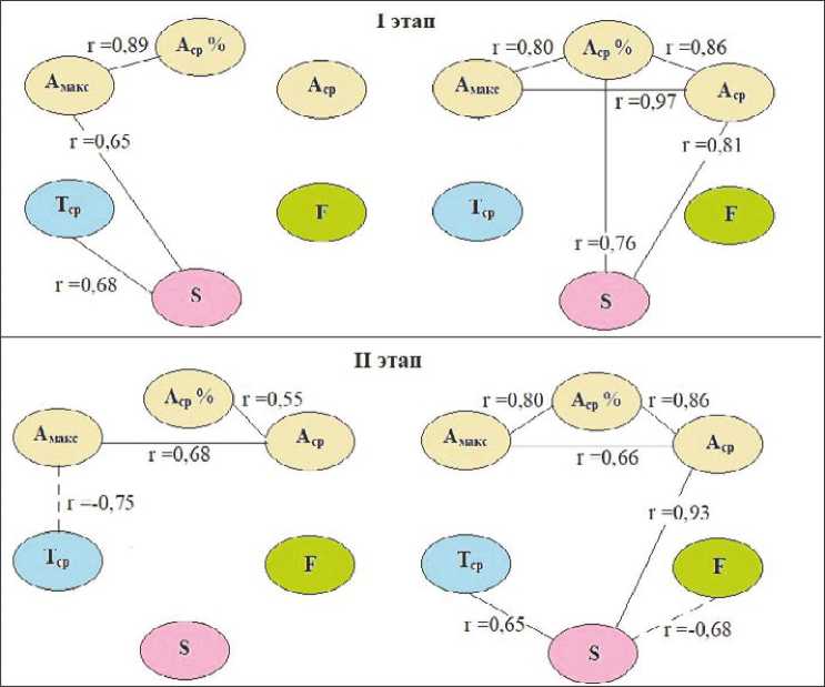 После пятинедельной тренировки (II этап) сохранялись описанные тенденции корреляционных связей между амплитудными характеристиками справа. В тоже время были выявлены отрицательные взаимоотношения максимальной амплитуды с длительностью повторений слева и площадью электромиограммы с частотными характеристиками справа.